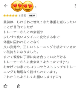 トレーニングは丁寧で分かりやすく、家でできるストレッチや食事のアドバイスまでしてくださるので、無理なく続けることができました。