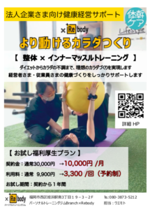 本契約は、運動習慣の定着を通じて心身のコンディション向上を図り、結果として企業全体のパフォーマンス向上に寄与することを目的としますRebodyは、継続可能で実効性のあるサポートを提供し、企業と従業員双方にとって価値ある環境づくりを目指します。